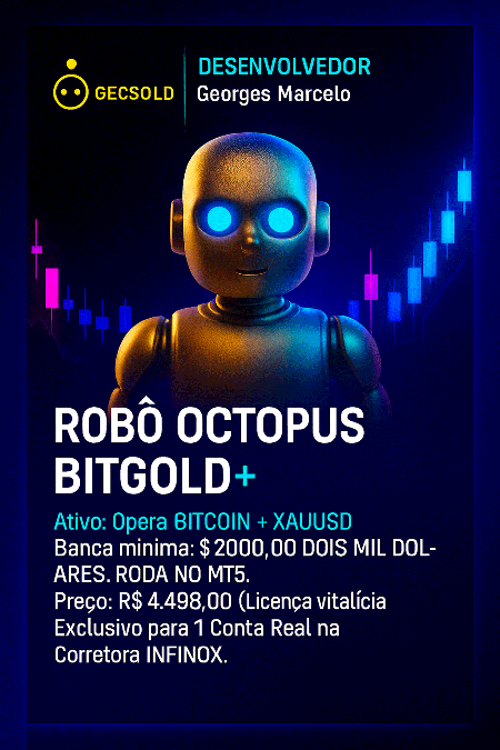 PODE SER APENAS COMPRANDO O ROBÔ + MENTORIA + TREINAMENTO BASTA ABRIR UMA CONTA REAL NA CORRETORA INFINOX. BANCA MÍNIMA DE $ 2.000,00 DÓLARES. RENDE APROX 5 A 25% POR SEMANA DD 35% APROX. TOTAL JA ACUMULADO: ROBÔ NOVO SEM HISTÓRICO. ** PARA ENVIAR O ARQUIVO DO ROBÔ + TREINAMENTO NO USO, MENTORIA R$ 4.998,00 REAIS. |