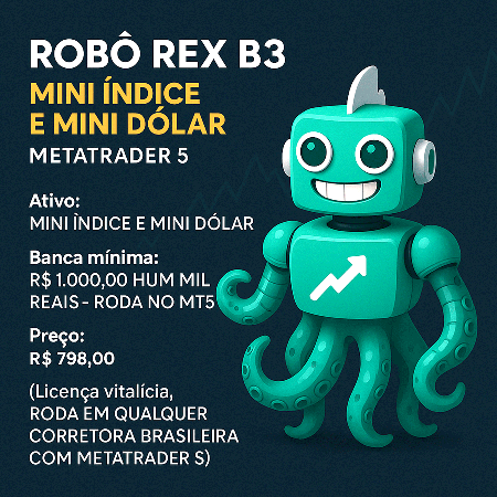 O ROBÔ REX DA B3 (MINI ÍNDICE E MINI DÓLAR), QUE CUSTA R$ 798,00 REAIS ( COMPRANDO PODE TESTAR E USAR NA DEMO E CONTA REAL. OS VIA COPYTRADER Não temos DEMO, é via sistema de Copytrader, espelhamento de Operações.